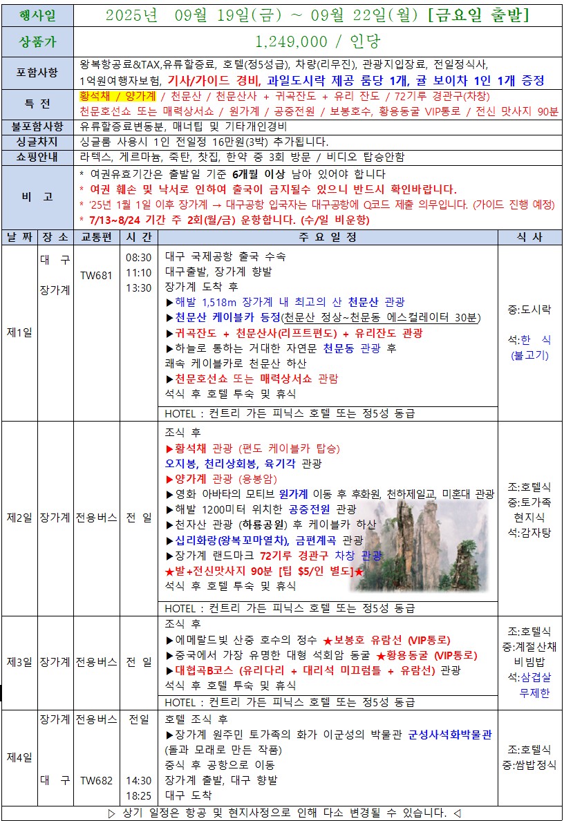 고객명 : 박○○님 , 출발일 : 2025-09-19 , 출발지 : 대구공항 , 여행지 : 장가계