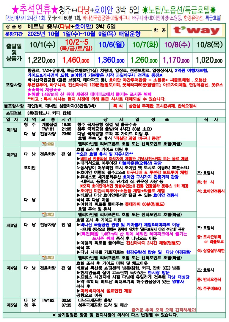 #1.★추석연휴★ 청주↔다낭+호이안 3박5일 ※노팁/노옵션/특급호텔